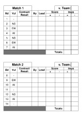 Match 1 v. Team: Bd Vul Contract/ By Lead Score Imps Result +- +- 1- 2 NS 3 EW 4 All 5 NS 6 EW 7 All Totals: Match 2 v. Team: Bd Vul Contract/ By Lead Score Imps Result +- +- 8- 9 EW 10 All 11 - 12 NS 13 All 14 - Totals: