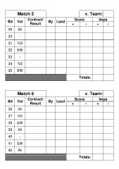 Match 5 v. Team: Bd Vul Contract/ By Lead Score Imps Result +- +- 29 All 30 - 31 NS 32 EW 33 - 34 NS 35 EW Totals: Match 6 v. Team: Bd Vul Contract/ By Lead Score Imps Result +- +- 36 All 37 NS 38 EW 39 All 40 - 41 EW 42 All Totals: